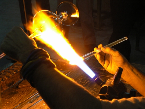 La pasta vítrea está en contacto con el exterior por una abertura dispuesta alrededor del horno, en primer lugar se le da a la pasta una forma cilíndrica y posteriormente el operario toma una pequeña cantidad de pasta con la caña que suele tener entre un metro y un metro cuarenta y cinco de longitud, y a través de ésta el artesano comienza a soplar para darle al objeto la forma deseada, de manera que el objeto no pierda nunca la maleabilidad, que le produce el calor del horno.