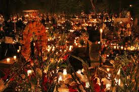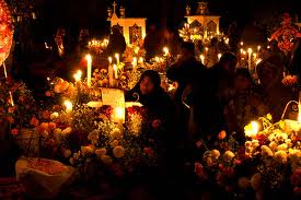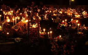 El Día de Muertos es una alegre celebración, pero la Noche de Muertos se torna lúgubre al sonar de las campanas. Todos empiezan a aparecer, vestidos de negro, con ofrendas, dulces y panes que dejan sobre las tumbas, donde se sientan a llorar y rezar por sus muertos.