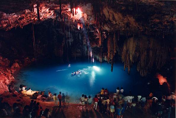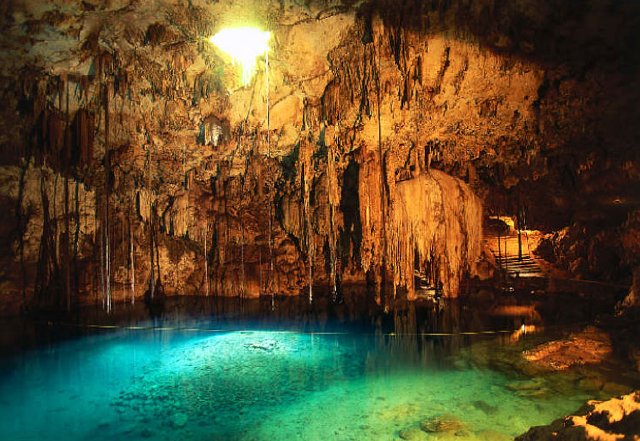 Cenote subterráneo que al medio día se embellece con el sol que se mete por un hueco e ilumina el agua transparente.