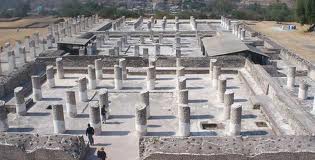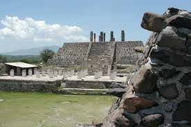 El Palacio Quemado que consta de plataformas con restos de columnas de planta cuadrada y círculos, que forman un corredor con la pirámide, y el juego de pelota, en el que se observa un relieve que representa a un jugador y una estatua de portaestandarte.