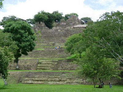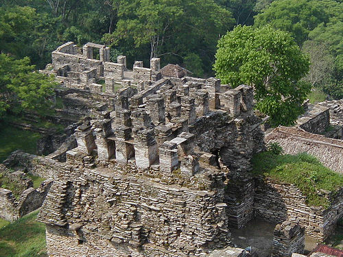 Al sitio se accede por la cancha del juego de pelota de los prisioneros, una de las mayores de su tiempo, situada en la gran plataforma, donde también se yergue el Altar de Sacrificios y se abre la cancha del juego de pelota de los Katunes, junto al cual hay varias muestras escultóricas. El palacio del inframundo se esconde en la tercera plataforma, mientras que en la cuarta se halla palacio de las grecas y la guerra, cuya fachada está compuesta por cuatro grecas espirales escalonadas.